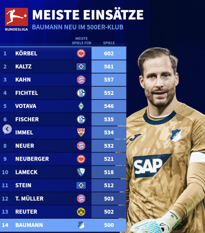 法兰克福传奇后卫卡尔-海因茨-科尔贝尔以602场领跑德甲历史出场榜;其次是汉堡后卫曼弗雷德-卡尔茨的581场以及拜仁传奇门将卡恩的557场。本轮完成自己第500次出场的35岁德国国门鲍曼排名第14位,有机会在赛季结束之后跃升至第9位。