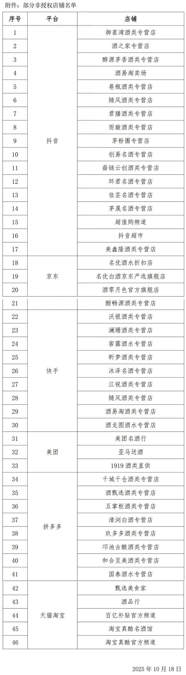 10月19日晚间,五粮液在《告知书》中公布在抖音、京东、快手、美团、拼多多、天猫淘宝等电商平台的46家非授权店铺。其中,抖音有17家,京东有4家,快手有9家,美团3家,拼多多有8家,天猫淘宝有5家。